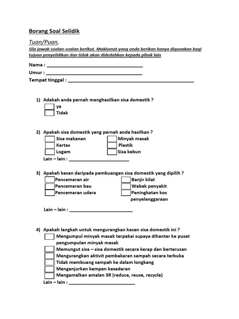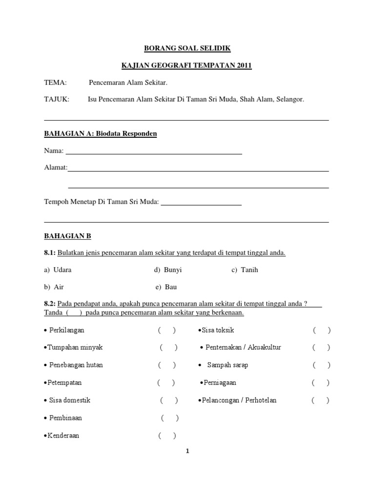 Related : Borang Soal Selidik Geografi Sisa Domestik / Contoh Borang Soal Selidik Geografi Tingkatan 1 Sisa Domestik Borang Soal Selidik Pasar Malam X Dak Ke - Pencemaran alam sekitar di kampung kuala ibai kuala terengganu borang soal selidik responden 1..